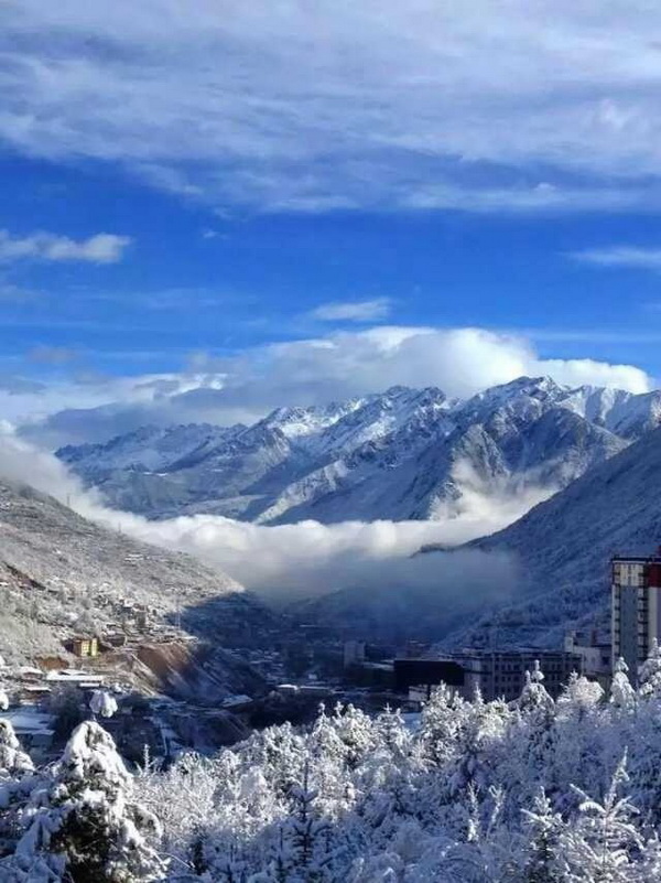 品味风、花、雪、月!那么你就一定要在四月来康定,大风从河谷的城市上空刮过,一趟趟地将城市周围的树木全部挂上了嫩芽!城中种植的腊梅花、桃花竞相开放、在没有乌云的夜晚,月亮总是那样透亮,就算是到了白天也要照着溜溜地康定城不忍离去,而我们今天说的是前天的这那一场雪。