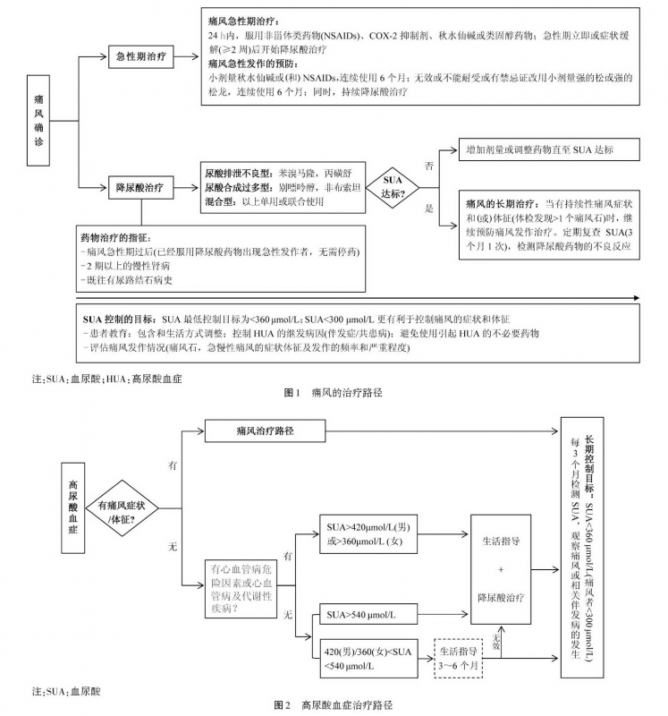 痛风作为与 HUA 直接因果相关的疾病,应严格控制血尿 360μmol/L 以下,最好达 300μmol/L,并长期维持。对于无症状的 HUA,也应予以积极地分层治疗。